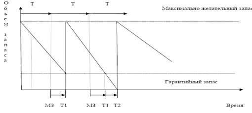 запаса формируется следующий заказ; Т1 – время поставки; Т2 – время задержки
