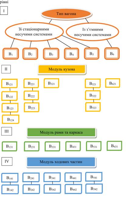 впровадження основних типів вагонів; ІІ рівень містить «Модуль кузова»; ІІІ рівень містить «Модуль рами та