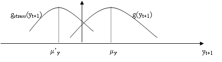 где yt+1 – значение доходности гипотетического портфеля, g(yt+1) – функция плотности распределения значений доходности гипотетического портфеля, my - математическое ожидание значения доходности гипотетического портфеля, gstress(yt+1) – функция плотности распределения значений доходности гипотетического портфеля при «стрессовом» событии, m’y - математическое ожидание значения доходности гипотетического портфеля при «стрессовом» событии.