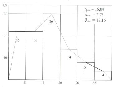 Рисунок 4.4. Гистограмма распределения общего числа коробочек хлопка.