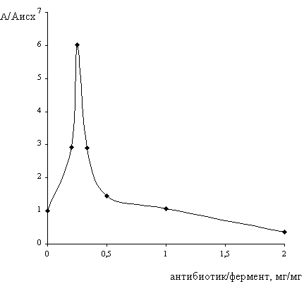 Кривая зависимости А/Аисх = f (антибиотик/фермент, мг/мг) имеет