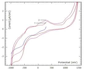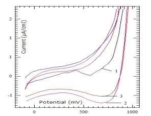 в пределах от -400 мВ до 1000 мВ на циклограмме заметных волн окисления и