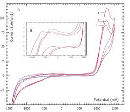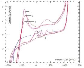 воды. Обратный ход ЦВА характеризуется наличием трех катодных пиков при потенциалах