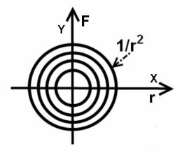 пропорционально квадрату расстояния (представляет собой аналог давления на