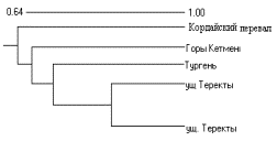 Рисунок 1- Кластерный анализ состояния ампликонов в RAPD-спектрах 5 популяций E. equisetina |