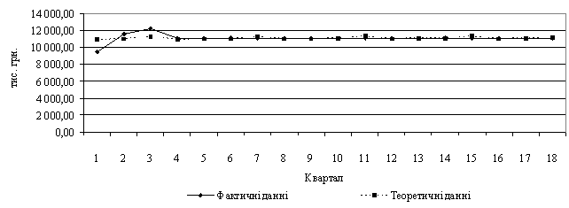 На одному графіку відкладемо фактичні значення рівнів часового ряду і теоретичні, отримані за адитивною моделлю (рис. 2).