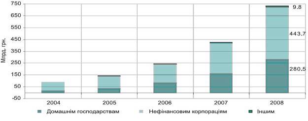 01.01.2009 р. становив 443.7 млрд. грн., з яких кредити підсектору державних