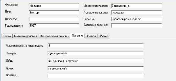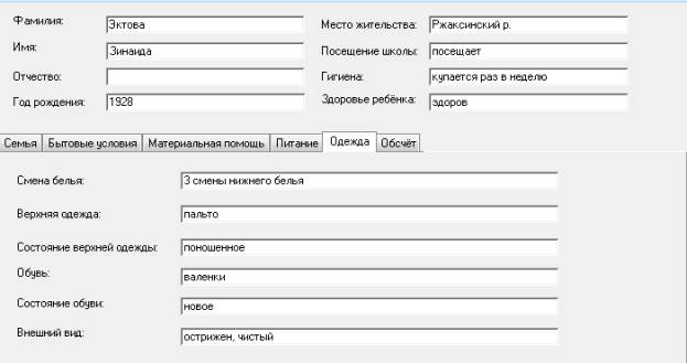 были положены акты инспекторов, обследовавших бытовые условия детей. В базе были созданы следующие разделы: число членов