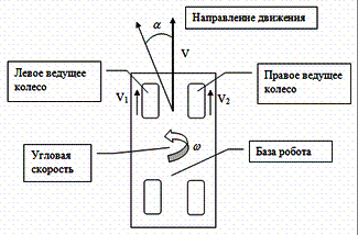 плоскости; V – скорость робота; V1 – скорость левого ведущего колеса; V2 –