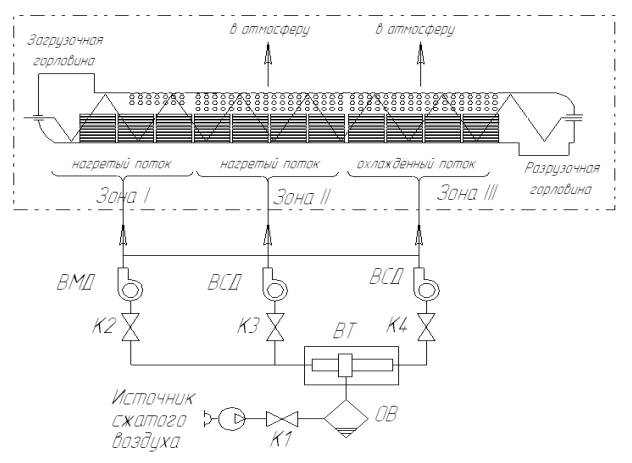 К1 регулируется подача сжатого воздуха, а через краны К1, К2 и К3 осуществляется подача соответственно горячих и