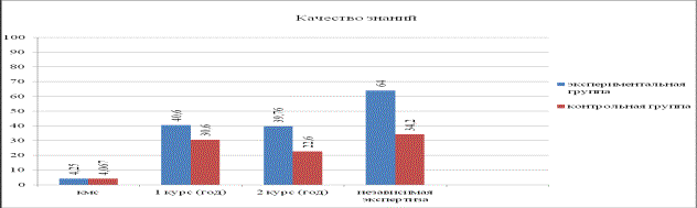 и «качество знаний» в контрольной и экспериментальной группах, соответственно.