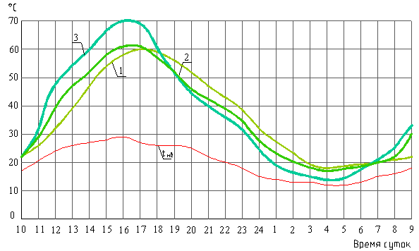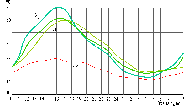 излучения, характерной для 10 часов утра при повышенной облачности: а – укрытие со стеклом; б – тоже с полиэтиленовой пленкой; в – тоже с поликарбонатом