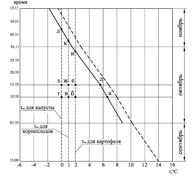 рис. 2), для корнеплодов и капусты в начале ноября (точки к, л на рис. 2)
