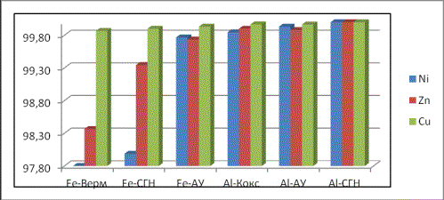 гальванопар: Fe- вермикулит, Fe-углеродминеральный сорбент (СГН), Fe- активированный уголь, Al-кокс, Al-активированный