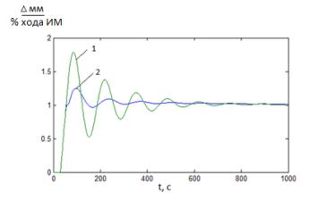 Рис. 2. Переходной процесс в системе без самонастройки (1) и в системе с самонастройкой (2) по каналу «задание-выход»