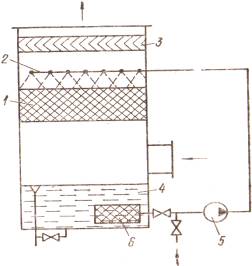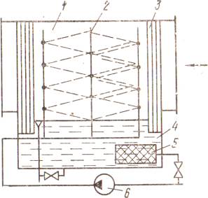 2 – трубный сток с форсунками; 3 – сепаратор; 4 – поддон; 5 – фильтр; 6 – насос