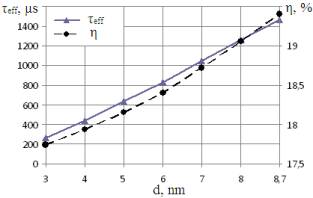 3 - Зависимость эффективного времени жизни (треугольники) и КПД (кружки) от