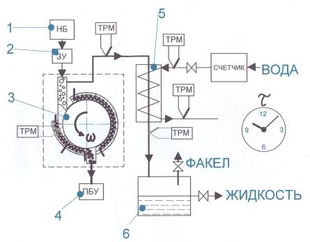 и жидкая часть направляется в приемный резервуар 6, неконденсированные газы сжигаются на факеле.