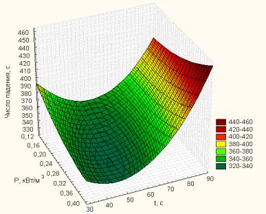 Зависимость числа падения муки от времени воздействия и удельной тепловой