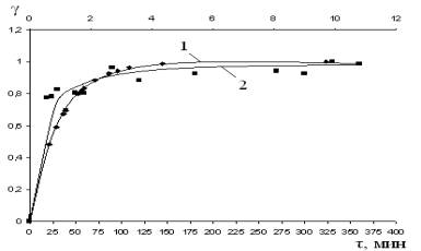координатах γ – τ: вычисленные (1) и экспериментальные (2)