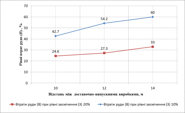 втрат руди від відстані між навантажувально-випускними виробками при її засміченні