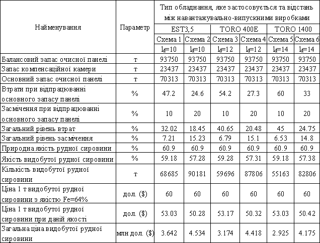 відстань між навантажувально-випускними виробками при застосуванні ЕST–3,5 буде становити 10 м, при застосуванні TORO 400Е – 12 м і при застосуванні TORO 1400 – 14 м [7].