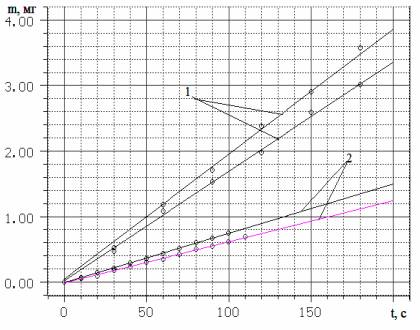 Зависимость изменения массы вытока жидкости из капилляра от времени протекания: