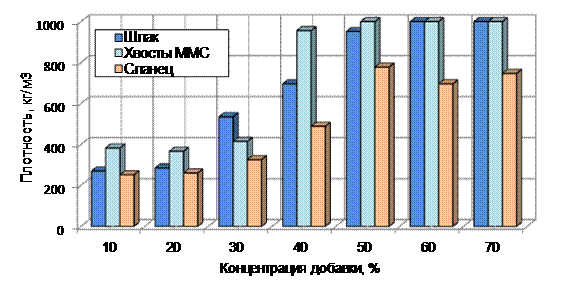 3). При увеличении содержания добавок свыше 40 % наблюдается рост плотности образцов,