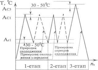 повітрі до температури Аr1 - (30-50 °С) і кількістю циклів 3-5, під час яких в поверхневому шарі й