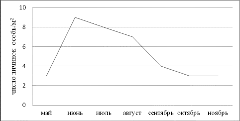 Рис. 2. Динамика количественного развития личинок слепней в водоёмах низменной