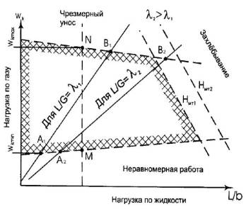 а сверху - чрезмерным уносом жидкости. Нагрузка по жидкости выражается через
