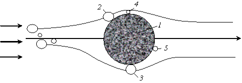 2 – частица, осаждающаяся за счет инерции; 3 – частица, осаждающаяся в результате