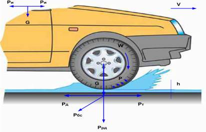 колесо транспортного средства действуют следующие силы: сила тяги на ведущих колесах, сила реакции дороги на опору колеса, сила