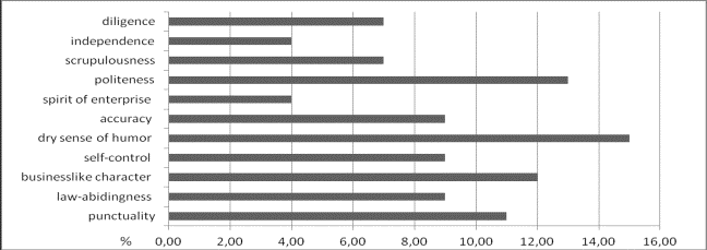 - 11%, law-abidingness - 9%, dry sense of humor – 15 %, businesslike character