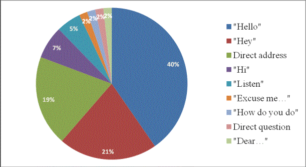 Вживання “Hello” – 40%, “Hi” – 7%, “Hey” – 21%, “Listen” – 5%, direct address –
