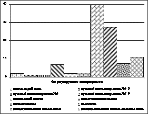На рис.1 в виде диаграмм представлены результаты расчетов долевого электропотребления исследуемых механизмов.