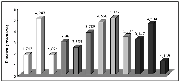 г÷íà äèíàì³êà çíà÷åíü á³îìàñè ³ ù³ëüíîñò³ íàñåëåííÿ åêîëîãî-ôàóí³ñòè÷íîãî êîìïëåêñó ïîä³áíà (ðèñ. 1, 2). Òàê, íàéìåíøèìè óïðîäîâæ ðîêó ïîêàçíèêàìè á³îìàñè â³äçíà÷àþòüñÿ îñòàííÿ òðåòèíà îñåí³ (1,168 êã/êì2) òà ïåðøà (1,713 êã/êì2) ³ îñòàííÿ (1,691 êã/êì2) òðåòèíè çèìîâîãî ïåð³îäó. гçêå çðîñòàííÿ á³îìàñè äî 4,943 êã/êì2 ïòàõ³â ó äðóã³é òðåòèí³ çèìè çóìîâëåíå ïîÿâîþ ó ìåæàõ ñòàö³¿ êî÷îâèõ ÷èêîòí³â. ²íø³ âèäè íå óòâîðþâàëè ÷èñëåííèõ ñêóï÷åíü.