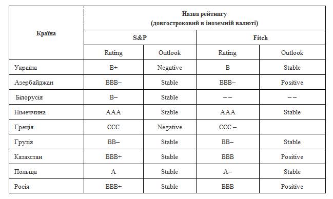 Аналізуючи місце України у світових рейтингах, можемо стверджувати про достатньо не стійку позицію серед країн світу взагалі та наглядно представлених країн Європи та СНД зокрема (див. табл. 1). Дана ситуація обумовлена тим, що не зважаючи на оптимістичні заяви влади, темпи виробництва знижувались, інфляція зростала, суттєвих реформ не відбувалось і як наслідок вже в 2013 році країна на межі дефолту, динаміка ВВП за прогнозами експертів від 0,5% до –1%, золотовалютні резерви зменшуються, а державний борг постійно зростає, проблеми з зовнішнім фінансуванням, масові невдоволення населення внутрішньою та зовнішньою політикою уряду, як наслідок S&P, Moody’s та Fitch знизили рейтинги у поточному році [5].