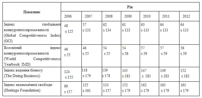 Таблиця 2. Індекси конкурентоспроможності для України, за період 2006–2012 року.