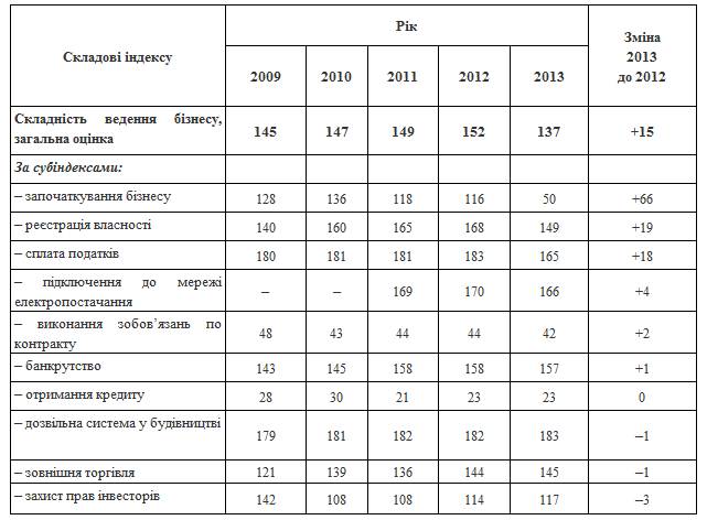 Таблиця 3. Місце України у рейтингу The Doing Business у 2009–2013 рр.