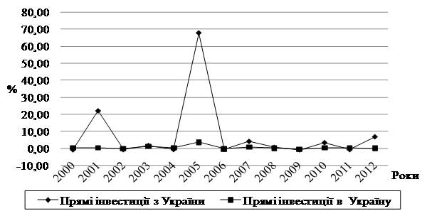 Рис. 1. Темп приросту прямих іноземних інвестицій, за період 2000–2012 рр.