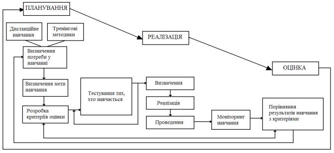 до уваги 3-етапну схему навчання (планування–реалізація–оцінка), результати останнього етапу (оцінка навчання) аналізуються