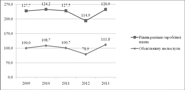 році порівняно з 2012 роком темп зростання обсягу реалізованих послуг склав