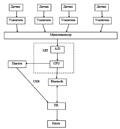 предложен исследовательский стенд для снятия информации работы мышц предплечья.