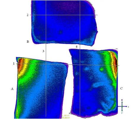 На рис. 9 показаны T1 изображения трех фантомов A, B, C с различной