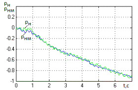 времени t, рн - измеренных в эксперименте, рнм – результата моделирования,