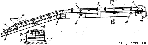 belt, the upper arm of which moves the material. Carrying rollers support the