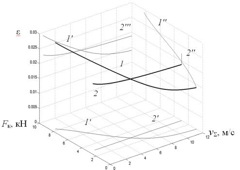 На рис. 3 представлена зависимость относительной скорости скольжения колеса локомотива от величины силы тяги и скорости движения (кривые 1 и 2), и “следы” этих кривых 1’и 2’; 1’’и 2’’; 1’’’и 2’’’в координатах [Fк;], [ε; ] и [ε;Fк].