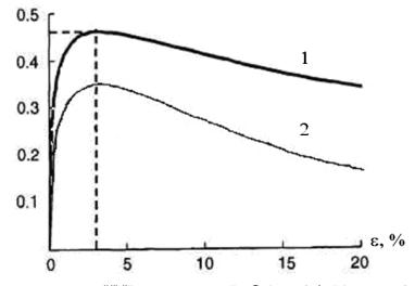Как видно из рис. 2, при eeкр температура линейно нарастает в зависимости от e. При e>eкр температура в зоне контакта уменьшается за счет увеличения глубины распространения тепла в рельсе, что приводит к частичному процессу рекристаллизации наклепанного поверхностного слоя.
