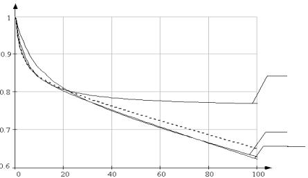 Рисунок 8. Нормированные кривые сцепления: полученные экспериментально - сплошные линии; расчетная - пунктирная линия, для трех групп электровозов